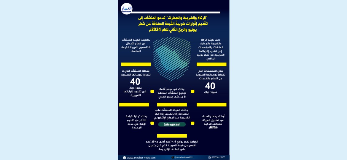 دعت هيئة الزكاة والضريبة والجمارك المنشآت من قطاع الأعمال الخاضعين لضريبة القيمة المضافة التي تتجاوز توريداتها السنوية من السلع والخدمات 40 مليون ريال، إلى تقديم إقراراتها الضريبية عن شهر يونيو الماضي، فيما دعت المنشآت التي لا تتجاوز توريداتها السنوية 40 مليون ريال إلى تقديم إقراراتها الضريبية عن الربع الثاني من عام 2024م، وذلك في موعدٍ أقصاه لجميع المنشآت المكلفة 31 من شهر يوليو الجاري.