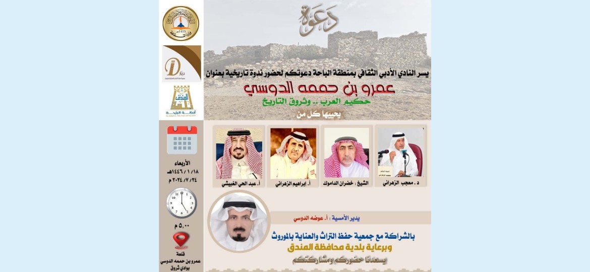 يقيم نادي الباحة الأدبي الثقافي بالشراكة مع جمعية ( ديار)لحفظ التراث والعناية بالموروث، ندوة بعنوان: (عمرو بن حممة الدوسي حكيم العرب - وثروق التاريخ)