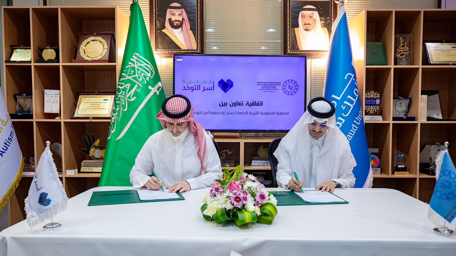 وقع مساء الاثنين الماضي سمو رئيس مجلس إدارة جمعية أسر التوحُّد الأمير سعود بن عبدالعزيز بن فرحان آل سعود مذكرة تفاهم مع الجمعية السعودية للتربية الخاصة ( جستر ) بوجود رئيس مجلس إدارة الجمعية الدكتور ناصر العجمي وحضور أمين عام الجمعية الأستاذة أريج المعلم .. في مقر جامعة الملك سعود بالرياض.