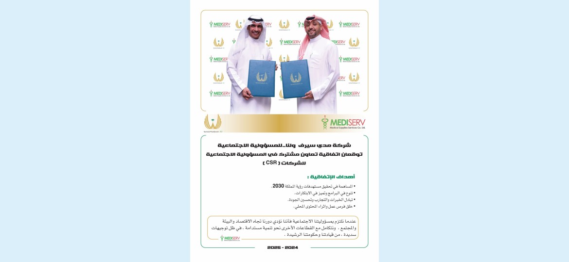 وقعت شركة مدي سيرف ولنا..للمسؤولية الاجتماعية اتفاقية تعاون مشترك تتكامل والدور الريادي الذي تقدمه شركة مدي سيرف في قطاع التوريدات والأدوية والتشغيل والتطوير وإدارة الوكالات العالمية، وتأتي هذه الاتفاقية حرصاً من شركة مدي سيرف والتزاماً بمسؤوليتها الاجتماعية تجاه الاقتصاد والبيئة والمجتمع نحو تنمية واستدامة.