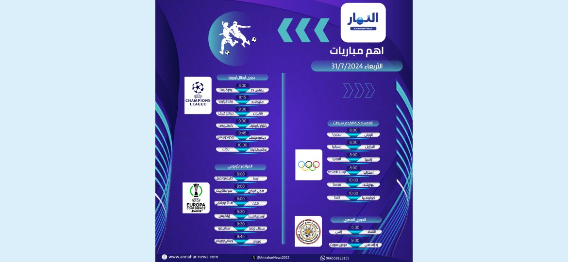يشهد يوم غدًا الأربعاء 31 يوليو 2024 العديد من المواجهات النارية في الدوري التمهيدي بدوري أبطال أوروبا ودوري المؤتمر الأوروبي بالإضافة إلى مباريات دور المجموعات بأولمبياد كرة القدم سيدات فرنسا 2024 ، ومبارتان في الدوري المصري.