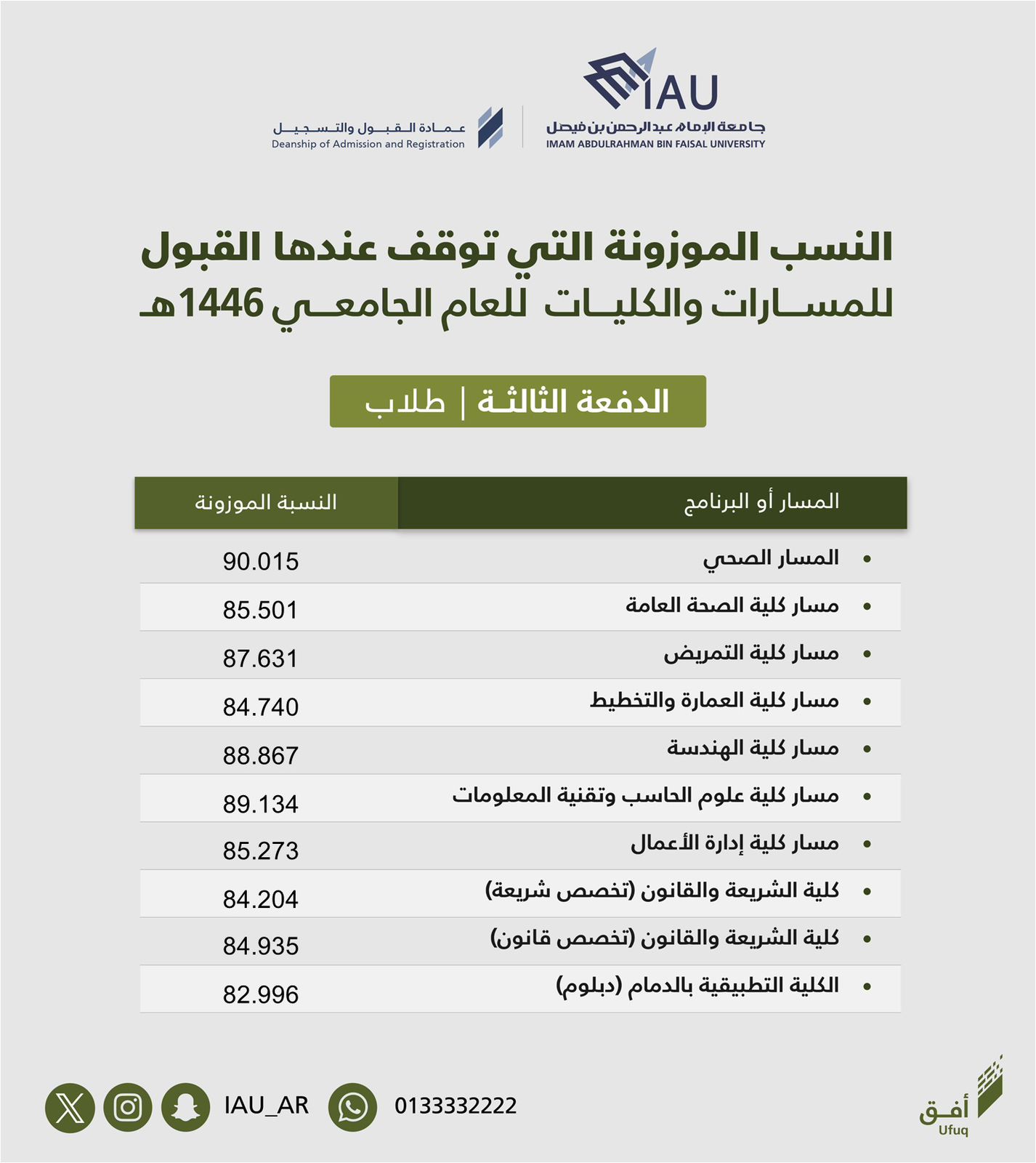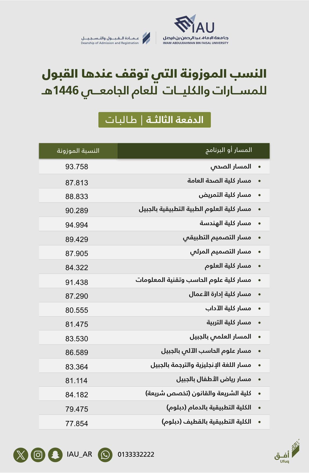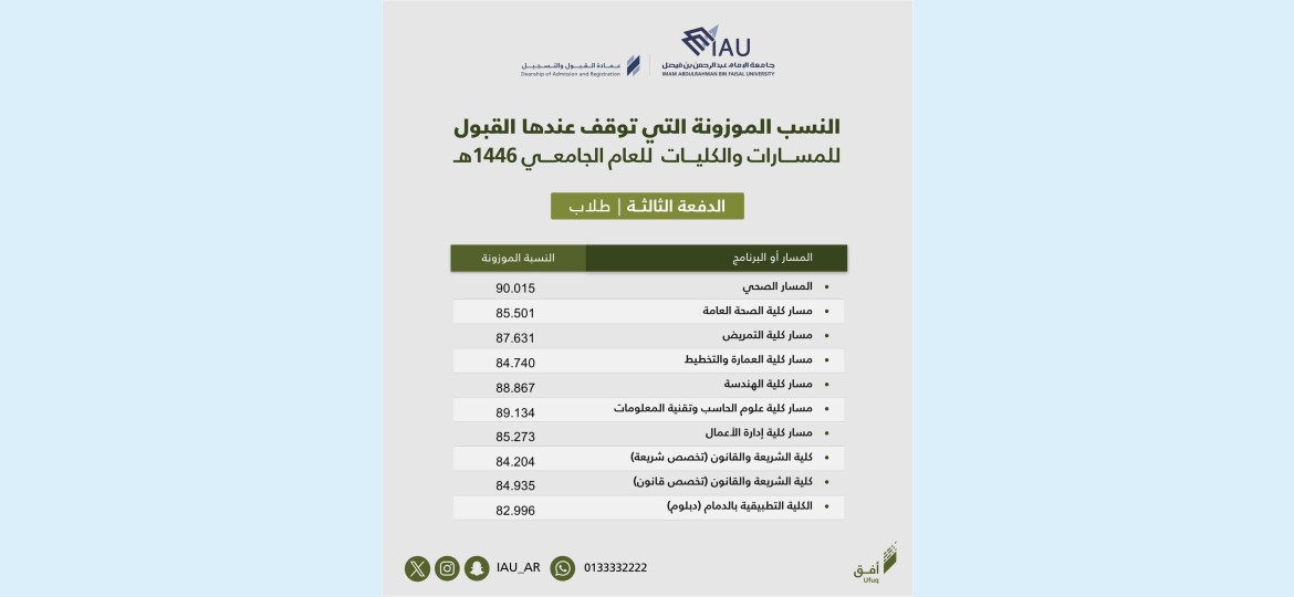 أعلنت جامعة الإمام عبد الرحمن بن فيصل ممثلة بعمادة القبول والتسجيل عن الدفعة الثالثة (الأخيرة) من الطلاب والطالبات المرشحين والمرشحات للقبول في مسارات السنة التحضيرية والبرامج الأخرى للعام الجامعي 1446هـ لتغطية كافة مقاعد القبول المتاحة والشاغرة.
