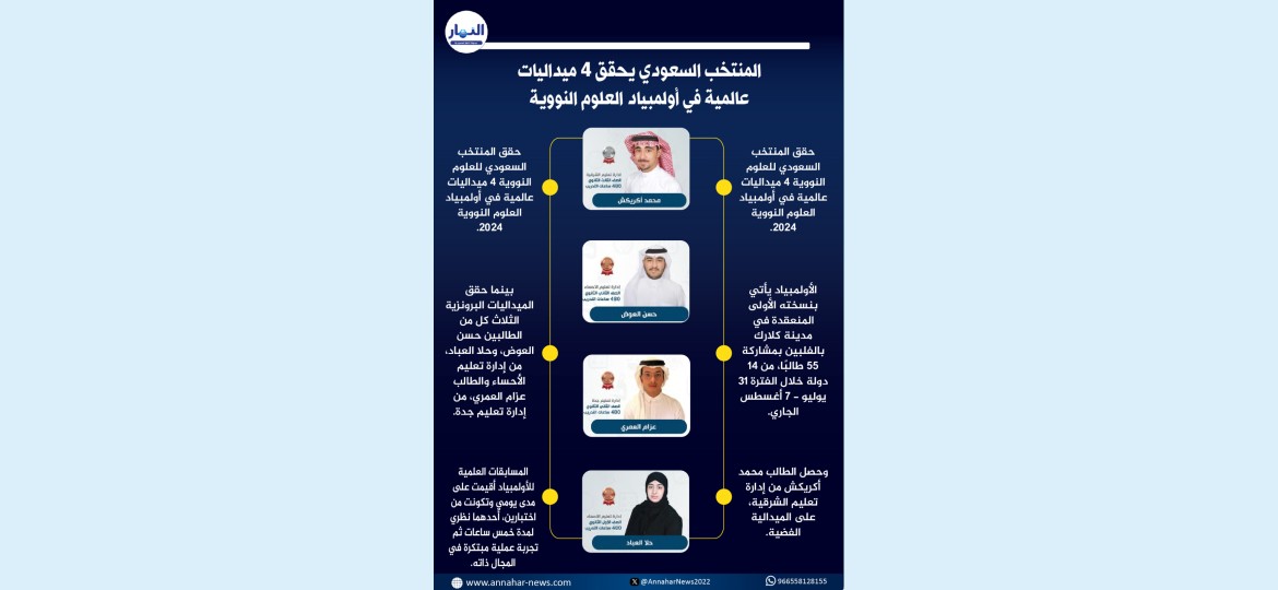 حقق المنتخب السعودي للعلوم النووية 4 ميداليات عالمية في أولمبياد العلوم النووية 2024، بنسخته الأولى المنعقدة في مدينة كلارك بالفلبين، بمشاركة 55 طالبًا، من 14 دولة، خلال الفترة 31 يوليو - 7 أغسطس الجاري.