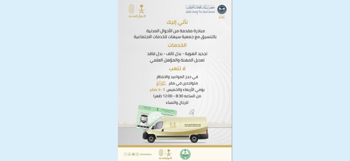 في إطار الجهود الحثيثة لتقديم خدمات أفضل وأكثر سهولة للمواطنين، أطلقت إدارة الأحوال المدنية بالتعاون مع جمعية سيهات للخدمات الاجتماعية المبادرة الثالثة من "نأتي إليك" في النصف الثاني من هذا العام، هذه المبادرة التي تهدف إلى تقديم الخدمات المختلفة للمواطنين في مقر جمعية سيهات للخدمات الاجتماعية.