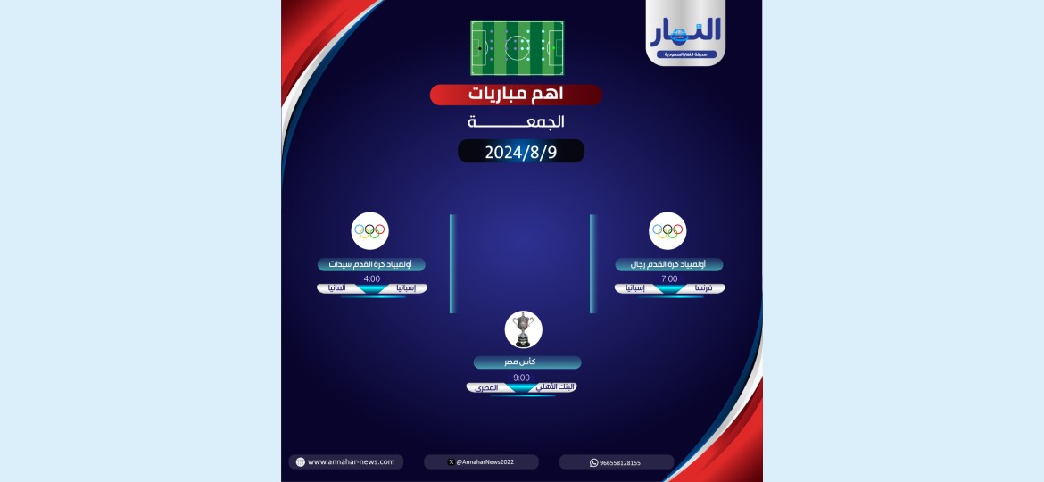 وتستعرض "صحيفة النهار السعودية" جدول مواعيد المباريات المزمع إقامتها يوم غدًا الجمعة: