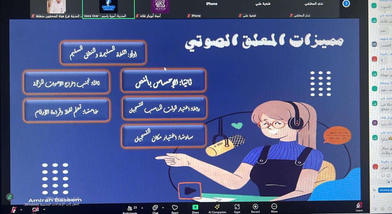 وشهدت الورشة التدريبية محاور عدة منها: أساسيات التعليق الصوتي، والتعرف على طبقات الصوت، كما تم تطبيق تمارين لبعض النماذج للمعلق الصوتي، وكيفية التسجيل الاحترافي والتسويق له.