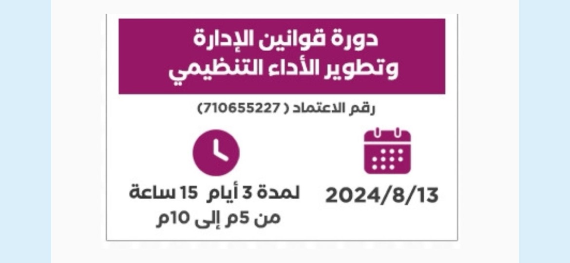 نظم فرع وزارة الشؤون الإسلامية والدعوة والإرشاد بالمنطقة الشرقية، ممثلاً بوحدة التدريب والتطوير، بالتعاون مع معهد ريبال للتدريب، دورة تدريبية بعنوان "قوانين الإدارة وتطوير الأداء التنظيمي".