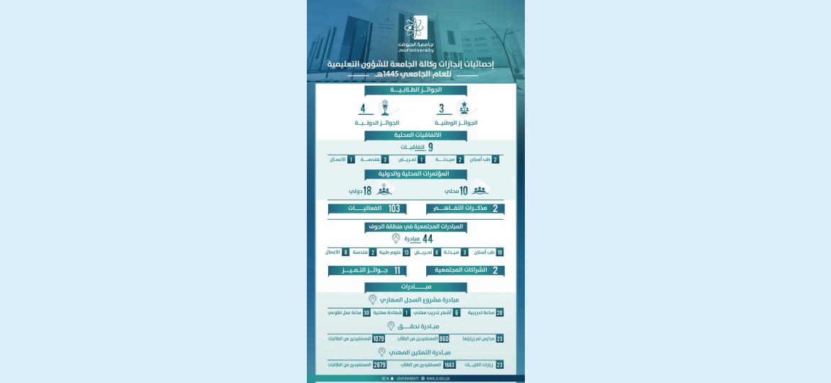 وكشفت الوكالة عن منجزات العام الجامعي 1445 هـ والتي تضمنت عقد اتفاقيات محلية تدعم أعمال الوكالة شملت 9 اتفاقيات في طب الأسنان والصيدلة والتمريض والهندسة والأعمال، والمشاركة في 10 مؤتمرات محلية و18 مؤتمرًا دوليًا، كما أبرمت مذكرتا تفاهم ونفذت الوكالة 103 فعاليات.