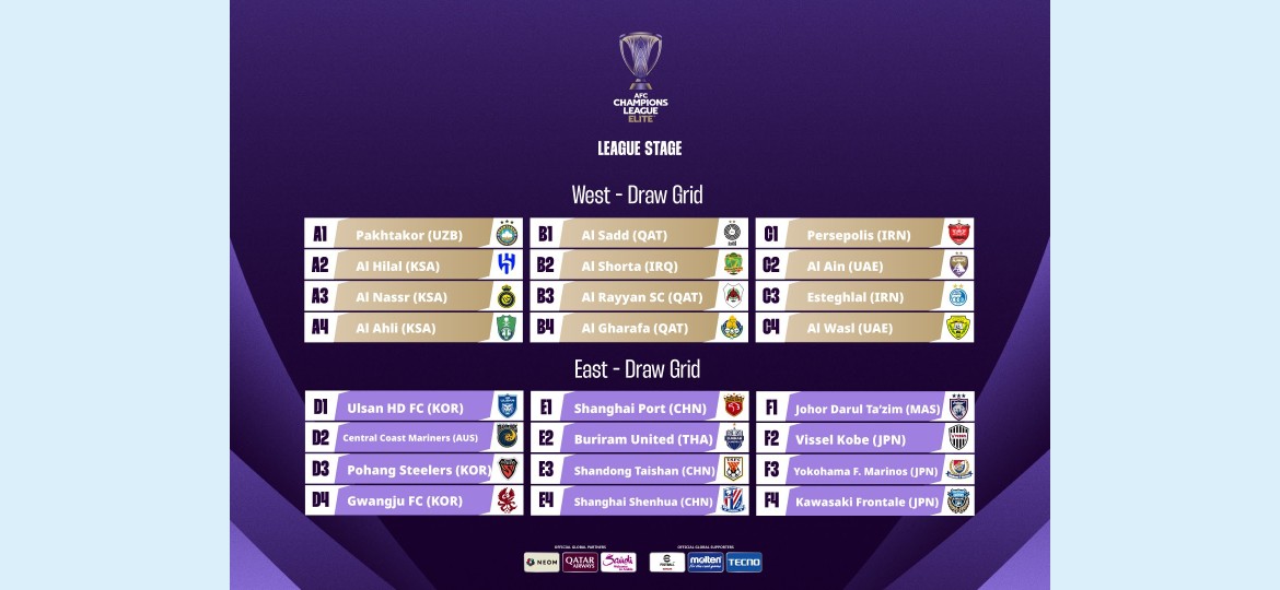 أجريت قرعة إلكترونية ظهر اليوم لأول دوري نخبة آسيوي والذي يضم 32 فريق مقسمة على منطقتي الغرب والشرق بالتساوي، وذلك في مقر الاتحاد الآسيوي لكرة القدم بالعاصمة الماليزية كوالالمبور.