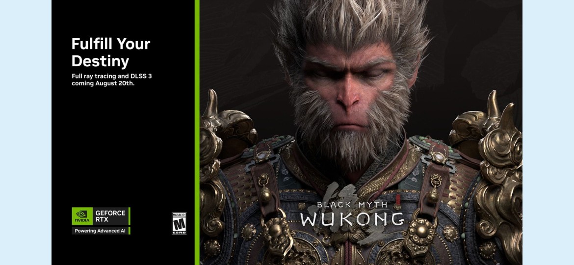 وتعد هذه اللعبة من نوع الأكشن وأدوار اللاعبين إلى أعلى مستوى ممكن. بفضل أفضل إضاءة وتأثيرات وانغماس بفضل قوة تتبع الأشعة وتقنية NVIDIA DLSS 3، يمكن للاعبين على أجهزة الكمبيوتر الاستعداد للاستمتاع بالرسوميات الغامرة ومواجهة الأعداء الصعبة بمعدلات إطارات عالية وسريعة الاستجابة. وتتميز اللعبة بالعديد من الميزات التقنية الحديثة مثل يعد تتبع معالجة الرسومات GeForce RTX 40 Series ونوى الذكاء الاصطناعي Tensor / Ray Tracing Cores الخاصة بها، تتمتع Black Myth: Wukong بإضاءة وانعكاسات وظلال بتتبع الأشعة الكامل، على غرار الحياة الواقعية.
