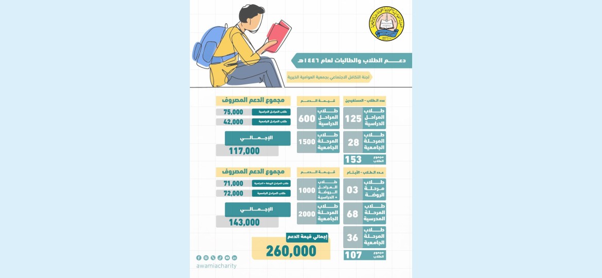 أقرت لجنة المساعدات بجمعية العوامية الخيرية صرف 260.000 ( مئتان وستون ألف ريال) للطلاب والطالبات المستفيدين من التكافل الاجتماعي للعام 1446هـ بهدف مساعدتهم على تغطية تكاليف احتياجاتهم الدراسية.