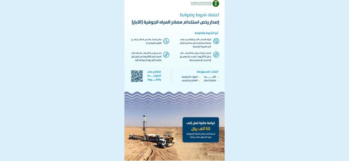 اعتمدت وزارة البيئة والمياه والزراعة، شروط وضوابط إصدار رخص استخدام مصادر المياه الجوفية "الآبار"، وتصنيف مخالفاتها؛ وفقًا لنظام المياه ولائحته التنفيذية، الذي يمنع استخدام أي مصدر مائي، أو تنميته، أو الإعداد له، إلا بعد الحصول على الرخصة اللازمة؛ وذلك للحفاظ على مصادر المياه الجوفية وحمايتها، وضمان استدامتها، وتنظيم شؤون استخداماتها.