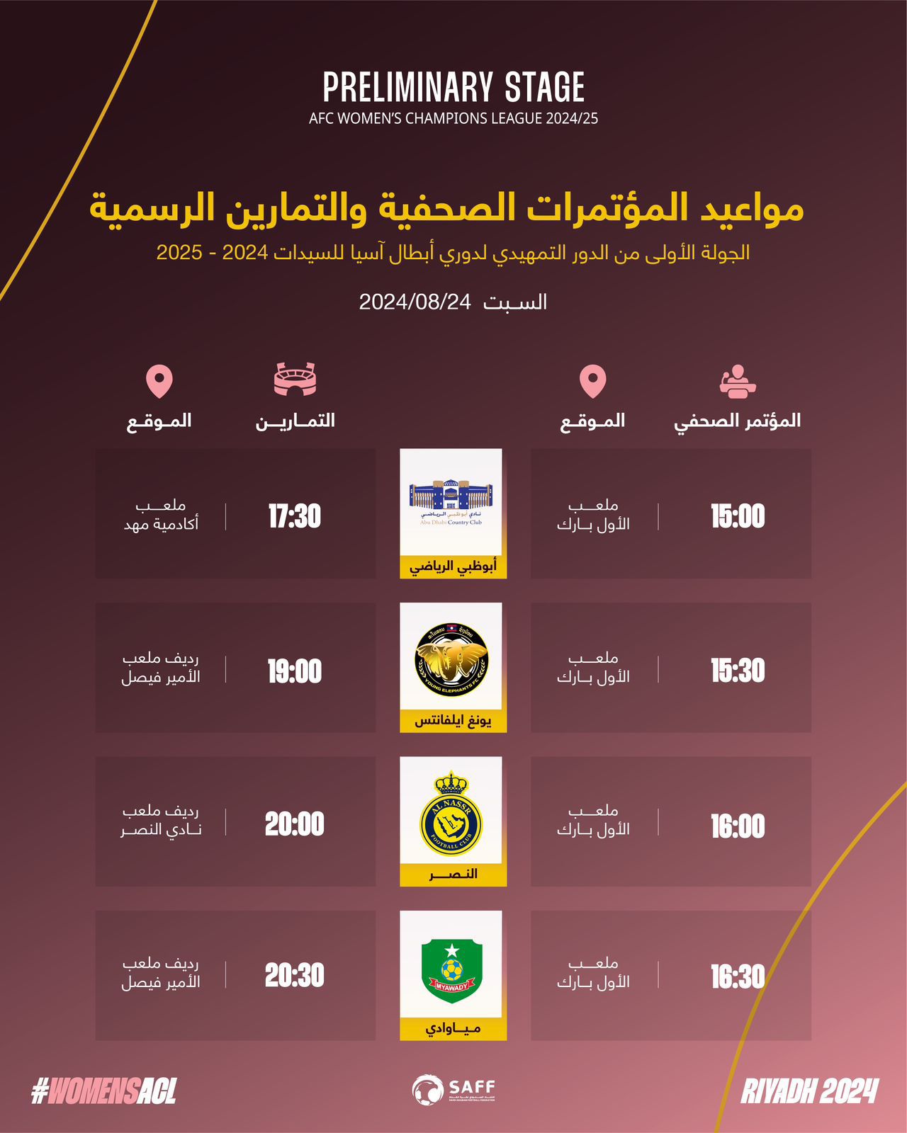 تنطلق يوم الأحد مباريات المجموعة الأولى من الدور التمهيدي لدوري أبطال آسيا للسيدات للموسم الرياضي 2024-2025 في نسخته الأولى والتي تستمر حتى الـ31 من أغسطس الجاري بمشاركة بطل الدوري السعودي الممتاز للسيدات فريق النصر.