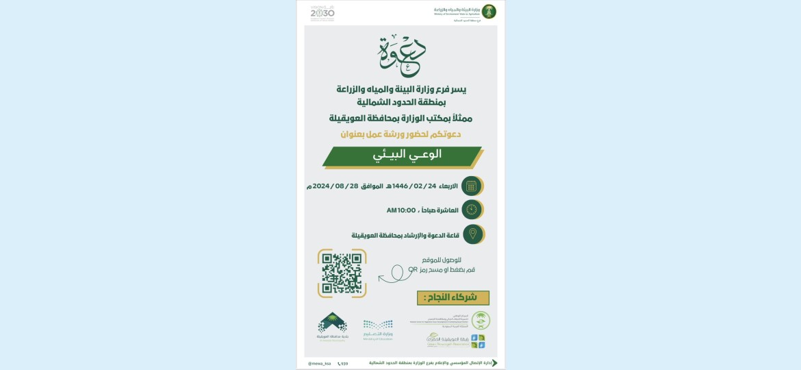 دعا فرع وزارة البيئة والمياه والزراعة بمنطقة الحدود الشمالية ممثلاً بمكتب الوزارة بمحافظة العويقيلة لحضور ورشة عمل بعنوان ( الوعي البيئي ) .