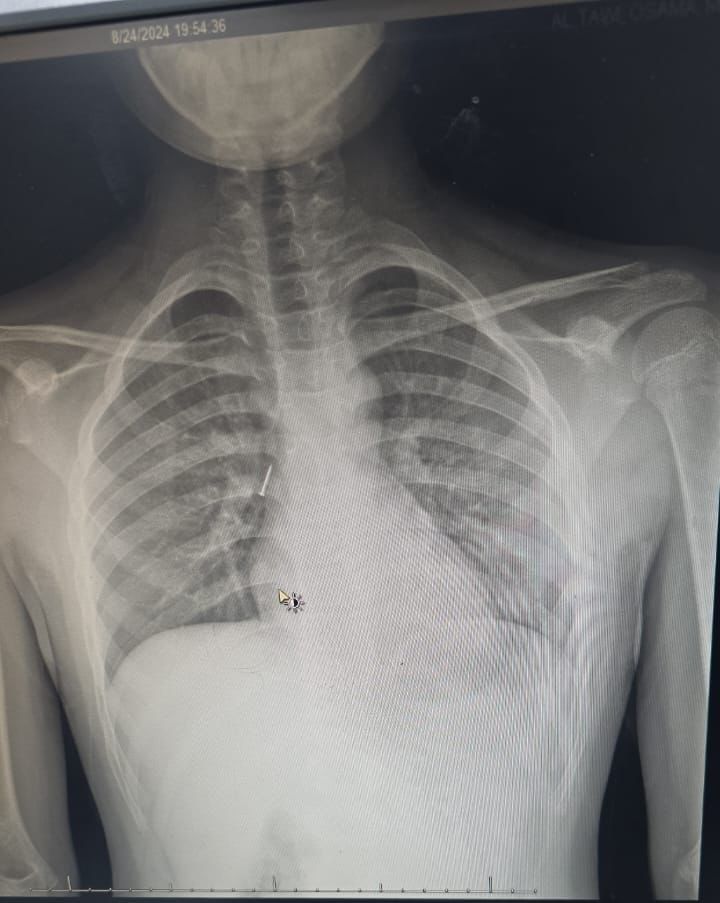 وقال الفريق الطبي المعالج بأن الطفل وصل للطوارئ وكان يعاني من آلام شديدة في الحلق وضيق في التنفس وتم وضعه على الأكسجين بعد أن تم قياس العلامات الحيوية له , وبعد تقييم الحالة من قبل أخصائي الطوارئ وأخصائي الأطفال وأخصائي الأنف والأذن والحنجرة تقرر نقل الطفل إلى العناية المركزة للأطفال كما تم عمل أشعة مقطعية دقيقة على الشعب الهوائية حددت مكان المسمار المعدني بدقة.