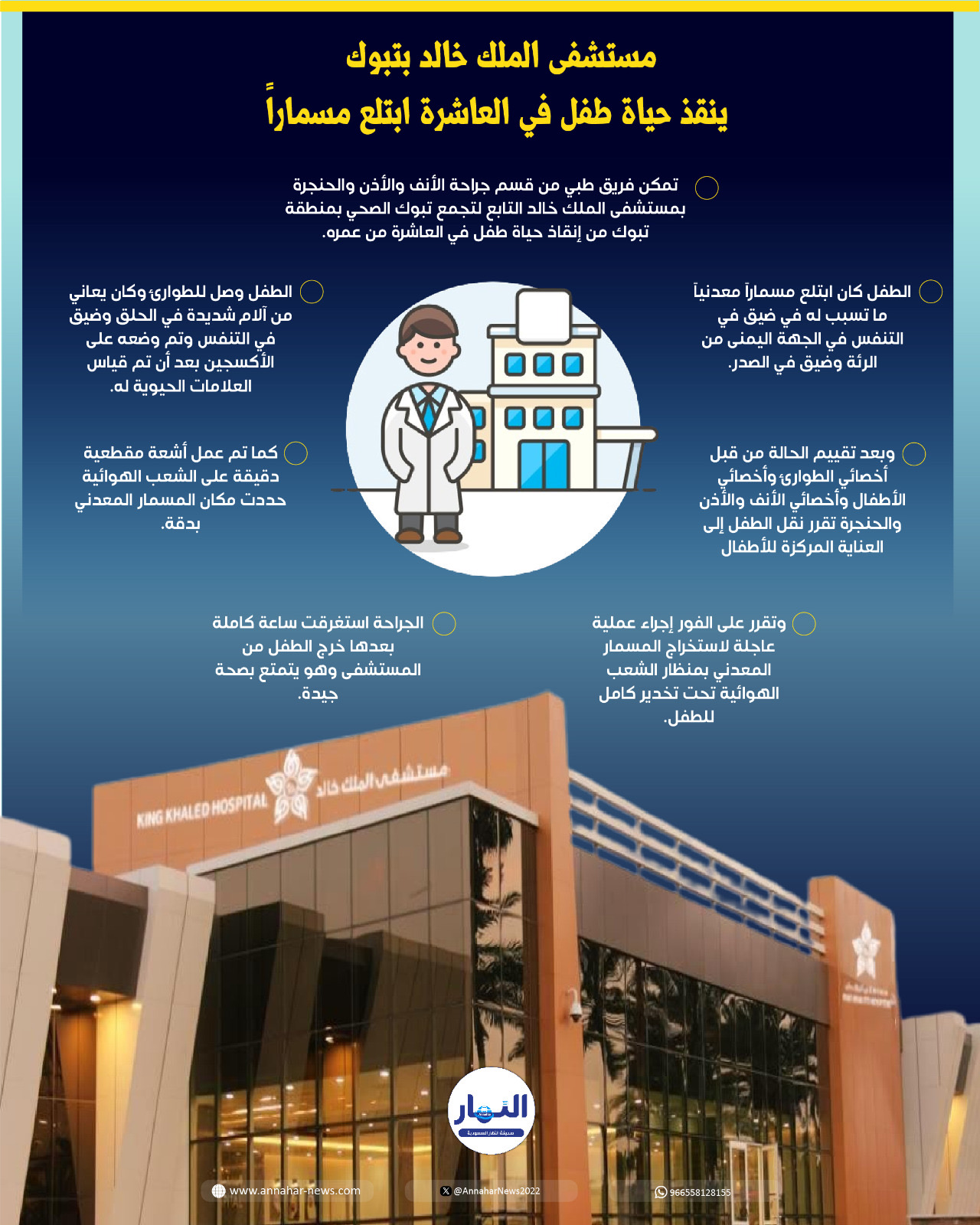 تمكن فريق طبي من قسم جراحة الأنف والأذن والحنجرة في مستشفى الملك خالد التابع لتجمع تبوك الصحي بمنطقة تبوك من انقاذ حياة طفل في العاشرة من عمره ابتلع مسماراً معدنياً مما تسبب له في ضيق في التنفس في الجهة اليمنى من الرئة وتضييق في الصدر.