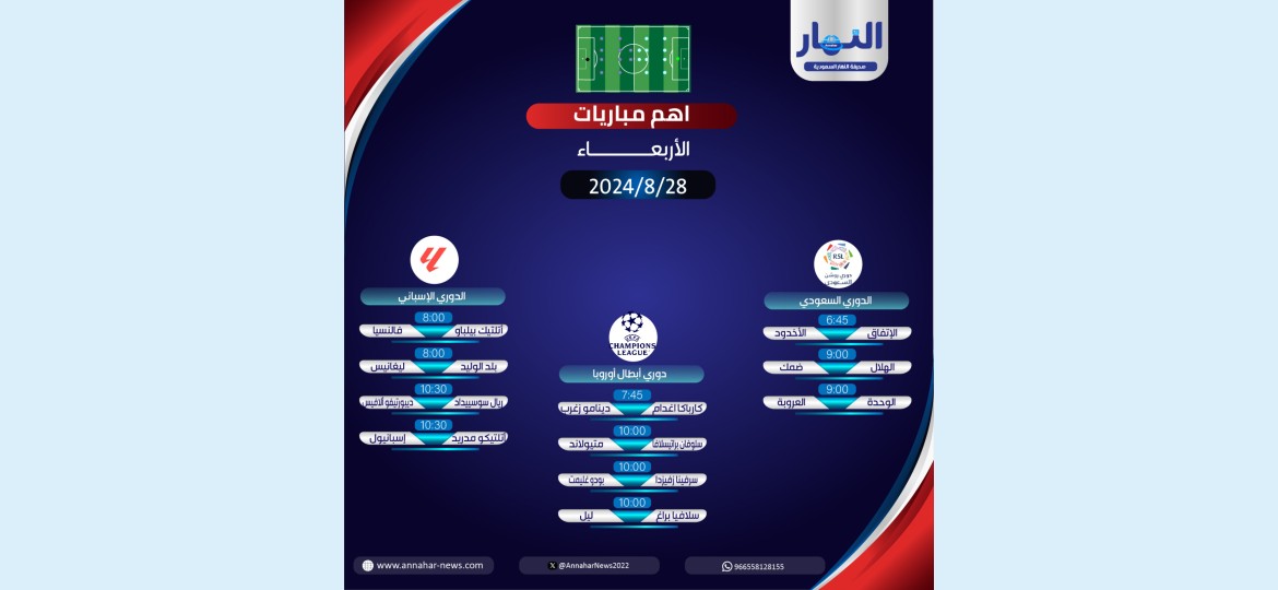 يحرص عشاق ومحبو كرة القدم على معرفة جدول مواعيد مباريات اليوم الأربعاء 28 / 8 / 2024م، في مسابقات كرة القدم في الدوريات الأوروبية وخاصةً في الدوري الإسباني ودوري أبطال أوروبا بالإضافة إلى دوري روشن السعودي للمحترفين