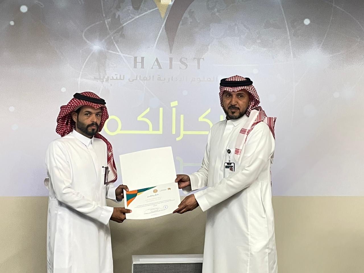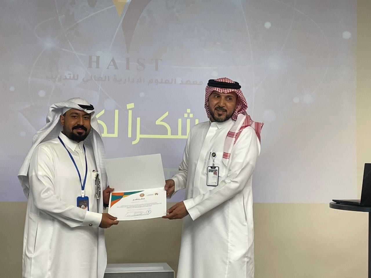 ونقل "العويصي" أثناء تسليم شهادات الشُكر لمدير فرع بنك التنمية الاجتماعية بحائل تركي المشاري ، ومدير معهد العلوم الإدارية العالي للتدريب محمد بن عقيل الشمري ، ومدرب الدورة عمر الصلحاني