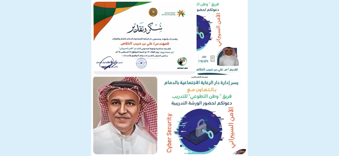 أقامت دار الرعاية الاجتماعية بالدمام التابعة لفرع وزارة الموارد البشرية والتنمية الاجتماعية بالمنطقة الشرقية ضمن "مبادرة مهارات" بالتعاون مع فريق وطن التطوعي للتدريب بمحافظة الأحساء ورشة عمل تدريبية عن بعد عبر منصة برنامج زووم بعنوان " الأمن السيبراني" يوم السبت 28 صفر الموافق ا سبتمبر 2024م، قدمها المهندس (ماجستير في تقنيات التعليم) علي بن حبيب الخلاص.