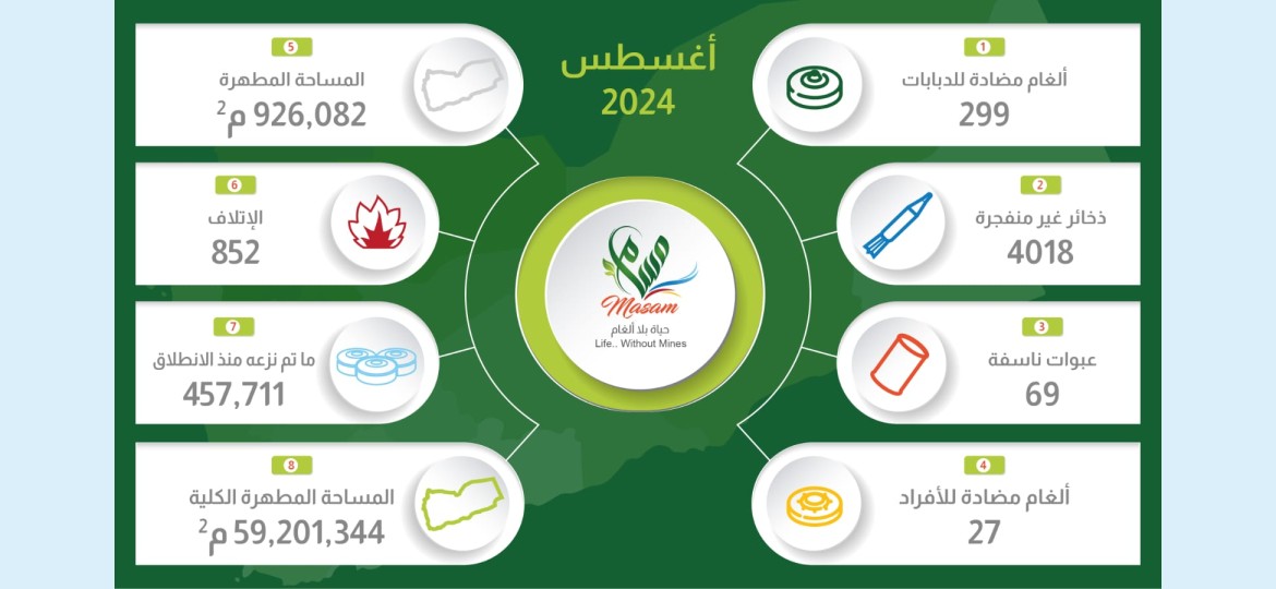 وفي هذا الإطار، أصدر المركز الإعلامي لمشروع «مسام» لنزع الألغام في اليمن تقريره الشهري، عن شهر أغسطس 2024م، حيث بين هذا التقرير أن إجمالي ما تم نزعه في هذا الشهر قد بلغ 4413 لغماً وقذيفة غير منفجرة وعبوة ناسفة.