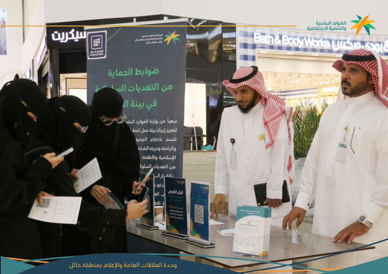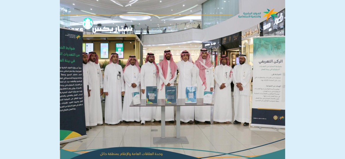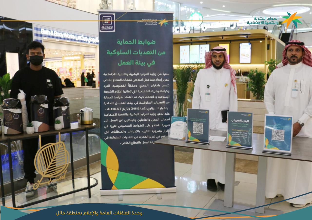 بإشرافٍ ومتابعةٍ من سعادة مدير مكتب العمل بمنطقة حائل علي النبري ، أقام المكتب ركناً تعريفياً في أحد المجمعات التجارية بالمنطقة للتعريف بضوابط الحماية من التعديات السلوكية في بيئة العمل ، وقد عمل في هذا الركن خبراء التعديات السلوكية بالمنطقة من نُخبةِ موظفي مكتب العمل وهم سلطان العنزي وخالد الشمري وأحمد العنزي .