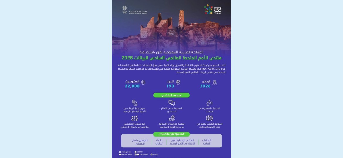أعلنت المجموعة رفيعة المستوى للشراكة والتنسيق وبناء القدرات في مجال الإحصاءات لخطة التنمية المستدامة لعام 2030 (HLG-PCCB) فوز المملكة ممثلة في الهيئة العامة للإحصاء باستضافة منتدى الأمم المتحدة العالمي السادس للبيانات 2026 في مدينة الرياض بأغلبية الأصوات على خلفية استعراض ملفات الدول المتقدمة وإيضاح إمكانياتها في استضافة هذا المنتدى الذي يمثل حدثًا عالميًا.
