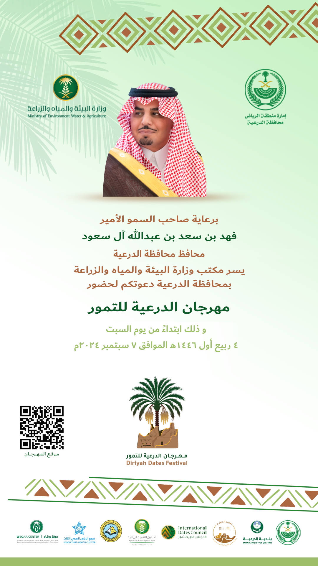 تحت رعاية صاحب السمو الأمير فهد بن سعد بن عبدالله بن تركي، محافظ الدرعية، أطلق فرع وزارة البيئة والمياه والزراعة بالرياض, "مهرجان الدرعية للتمور" على مدى عشرة أيام بمشاركة القطاعات الحكومية بالمحافظة وعدد من الجمعيات.