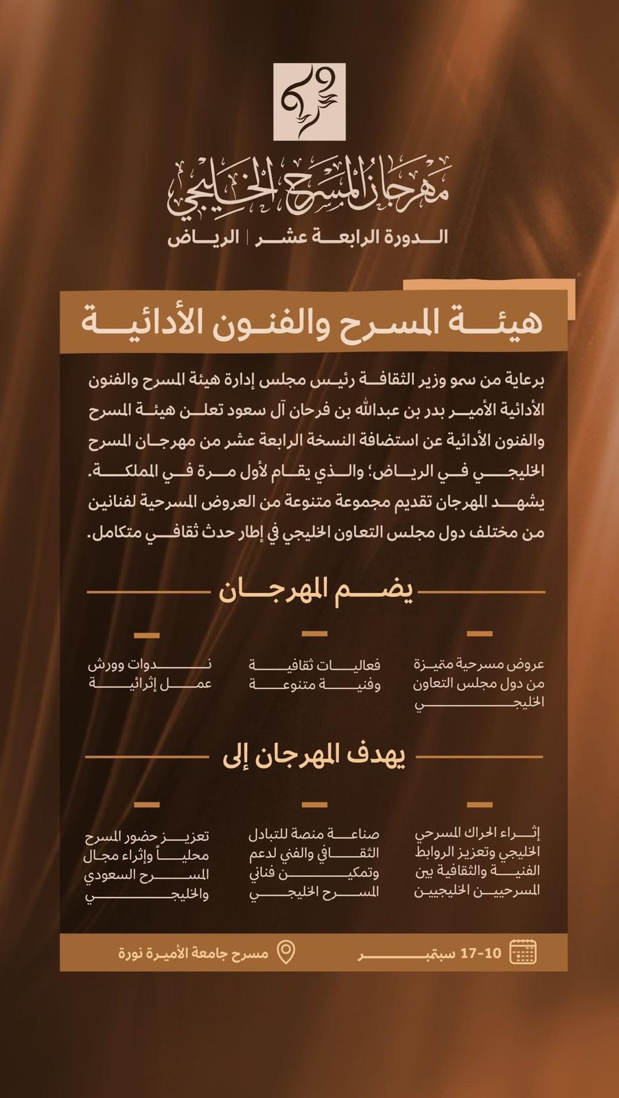 برعاية من سمو وزير الثقافة رئيس مجلس إدارة هيئة المسرح والفنون الأدائية الأمير بدر بن عبدالله بن فرحان آل سعود، تستضيف هيئة المسرح والفنون الأدائية، مهرجان المسرح الخليجي في نسخته الرابعة عشرة في الرياض، على مدى ثمانية أيام، اعتبارًا من مساء اليوم الثلاثاء 10 حتى 17 سبتمبر المقبل، في تجمعٍ ثقافي مسرحي لفنانين ومبدعين من دول المجلس التعاون الخليجي تستضيفه المملكة للمرة الأولى.
