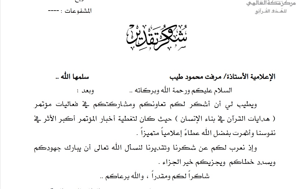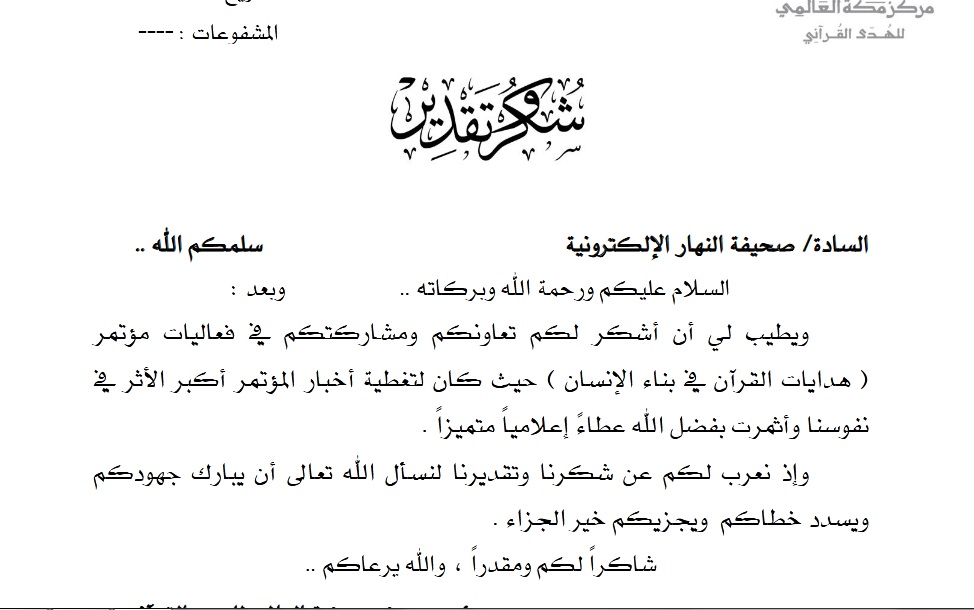 قَدَّم مركز مكة العالمي للهدى القرآني بَالِغ الشُّكْر والامْتنان لصحيفة ” النهار السعودية” من خلال خطاب شكر وتقدير تَلَقتهَ الصحيفة .