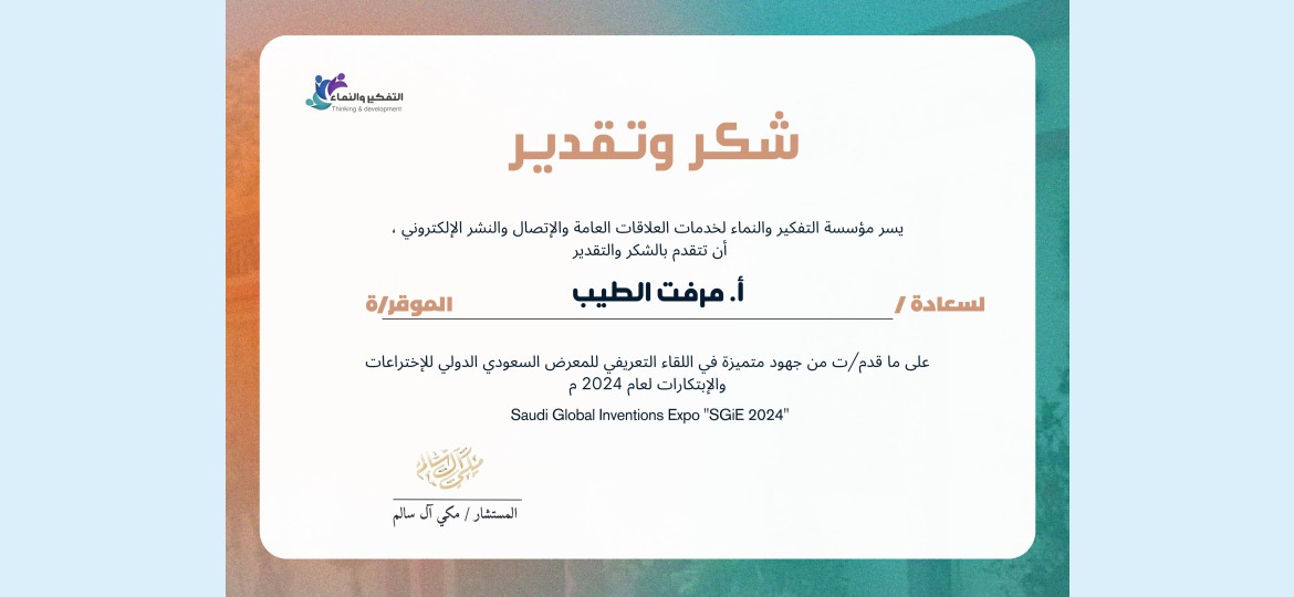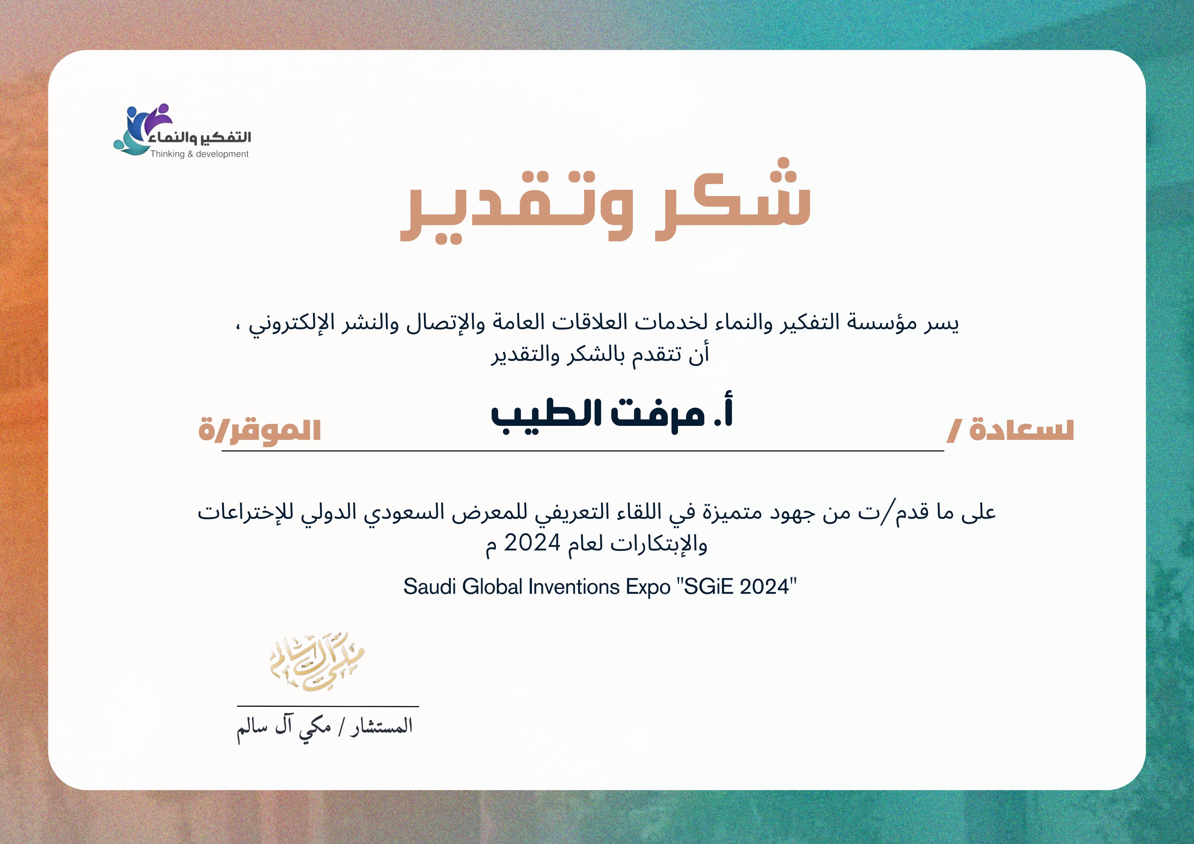 كرّمت مؤسسة التفكير والنماء لخدمات العلاقات العامة والإتصالات والنشر الالكتروني صحيفة النهار السعودية، ومحررتها الإعلامية مرفت بنت محمود طيب، كلاً منهما بشهادة شكر وتقدير على ما قدموه من جهود متميزة في التغطية الإعلامية للقاء التعريفي للمعرض السعودي الدولي للاختراعات والابتكارات لعام 2024 SGIE في نسخته الثانية والذي أقيم في مدينة الطائف عروس المصايف.