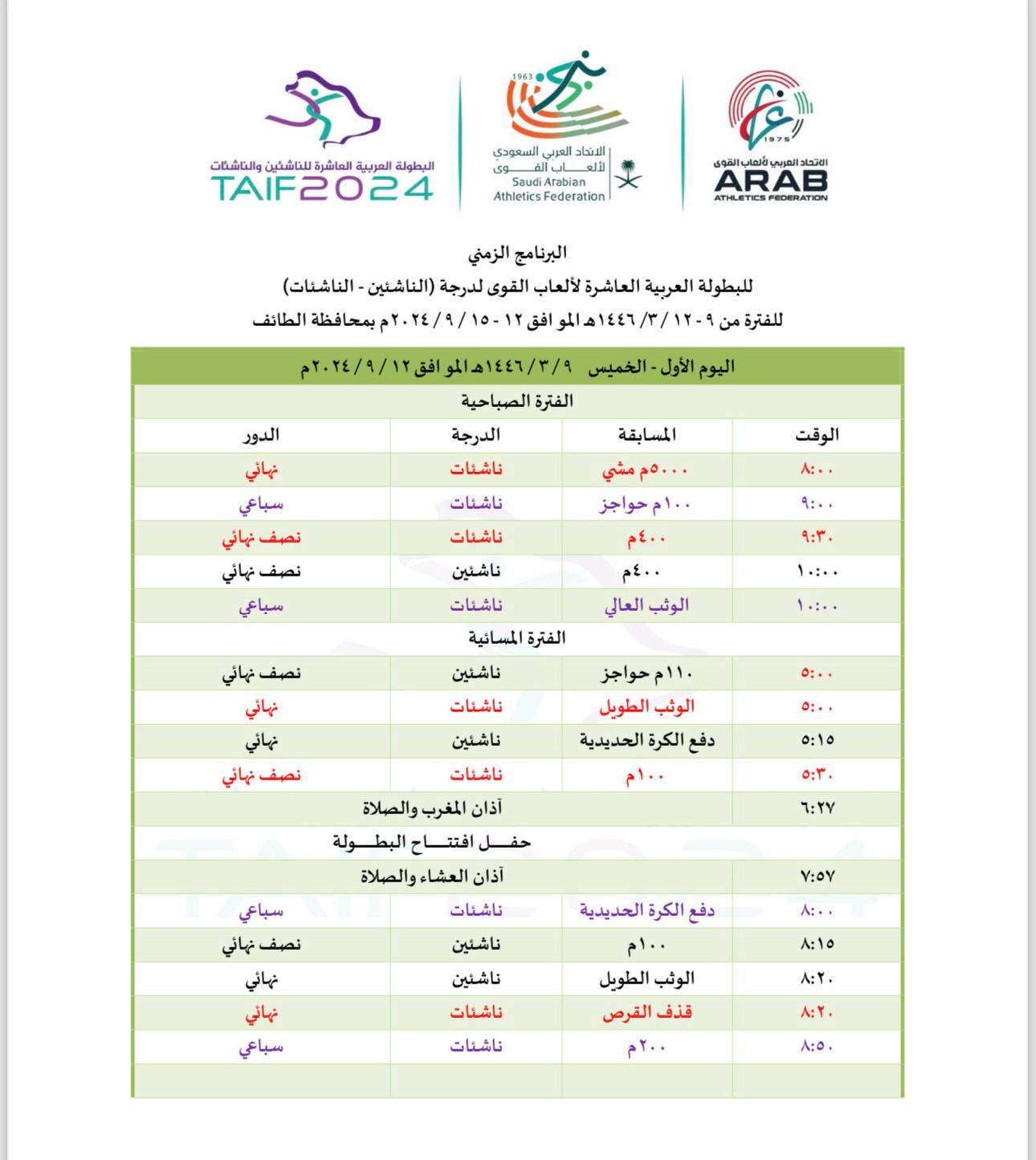 بمتابعة واهتمام من صاحب السمو الملكي الامير سعود بن نهار ال سعود محافظ الطائف تفتتح البطولة العربية العاشره للناشئين والناشئات لالعاب القوى وذلك يوم غدالخميس على مضمار وميدان مدينة الملك فهد الرياضيه بالحويه وللفترة من 12 وحتى 15من شهر سبتمبر وبتنظيم من الاتحاد السعودي لالعاب القوى و الاتحاد العربي لالعاب القوى وذلك بمشاركة 18 دوله يمثلها 241 لاعباً يتنافسون في 20 مسابقة ويسعون خلالها لانتزاع المراكز الاولى والصعود لمنصات التتويج ،ويأتي منتخب المملكة العربية السعوديه في مقدمة المشاركين الى جانب منتخبات الاردن والامارات ومصر واليمن والبحرين وقطر والامارات والكويت وعمان وسوريا ولبنان والجزائر والسودان والعراق والمغرب وتونس وموريتانيا وليبيا .