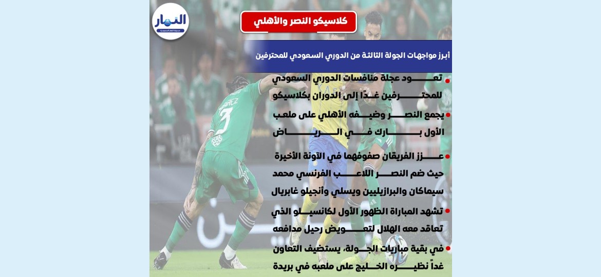 تعود عجلة منافسات الدوري السعودي للمحترفين غدًا إلى الدوران عقب التوقف الدولي بكلاسيكو كبير يجمع النصر صاحب النقاط الـ 4 وضيفه الأهلي بـ 3 نقاط على ملعب الأول بارك في الرياض في افتتاح الجولة الثالثة، حيث يأمل الأول إلى مواصلة صحوته بعد فوزه الكبير على الفيحاء بنتيجة 1-4 في الجولة الثانية عقب تعثره المفاجئ في الافتتاح أمام نظيره الرائد بنتيجة 1-1، ويطمح الثاني في استعادة التوازن عقب خسارته أمام الفتح في الجولة الماضي 0-1.