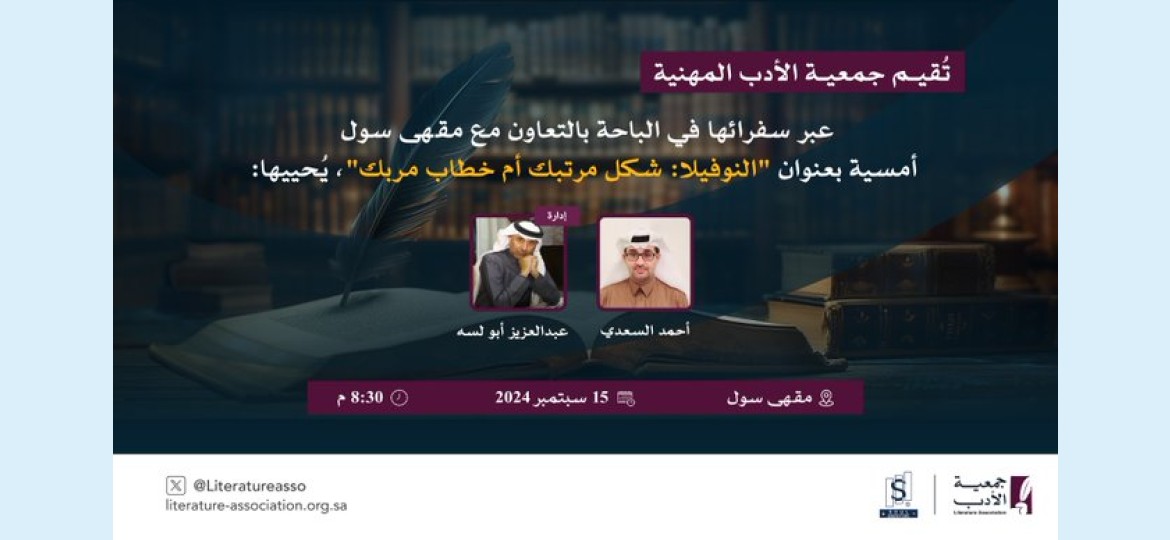 تقيم جمعية الأدب المهنية بالباحة أمسية تحت عنوان "النوفيلا: شكل مرتبك أم خطاب مربك"، يحييها، كل من أحمد السعدي، وعبدالعزيز أبو لسة، وذلك بمقهى سول، يوم الأحد الموافق 15 سبتمبر 2024، في تمام الساعة الثامنة والنصف مساءً.