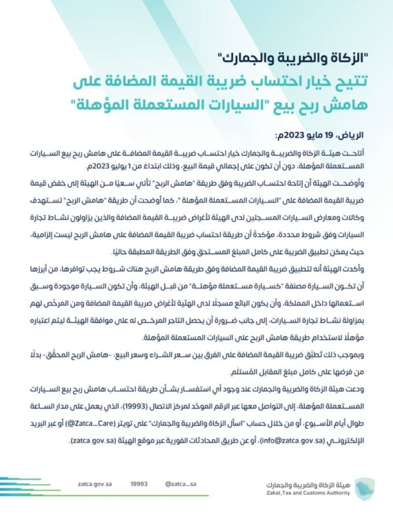 أتاحت هيئة الزكاة والضريبة والجمارك خيار احتساب ضريبة القيمة المضافة على هامش ربح بيع السيارات المستعملة المؤهلة، دون أن تكون على إجمالي قيمة البيع، وذلك ابتداءً من 1 يوليو 2023م.