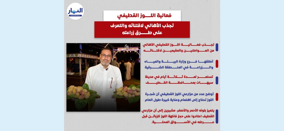 تجذب فعالية اللوز القطيفي التي أطلقها فرع وزارة البيئة والمياه والزراعة في المنطقة الشرقية, بمشاركة عدد من المزارعين وبائعي الخضار والفواكه والأسر المنتجة في المحافظة، الأهالي من المواطنين والمقيمين لاقتنائه، حيث تستمر لمدة ثلاثة أيام في مدينة سيهات بمحافظة القطيف, بهدف تعريف زوار المعرض بهذه الفاكهة وطرق زراعتها والعناية بها.