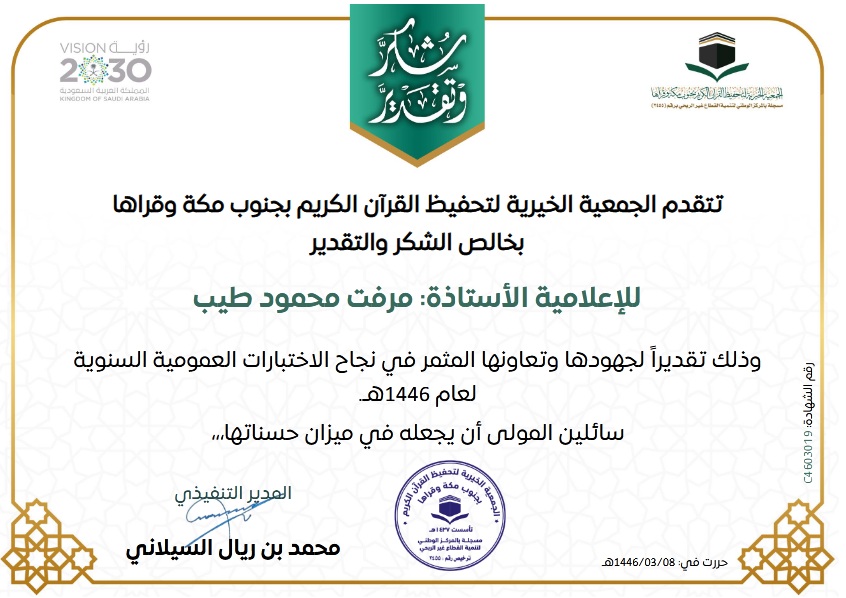 وبدورها توجهت الصحيفة ومحررتها ببالغ الشكر والامتنان للجمعية الخيرية لتحفيظ القرآن الكريم بجنوب مكة وقراها على هذه اللفته النبيلة الغير مستغربة من قبلهم والشكر موصول للمدير التنفيذي للجمعية الشيخ محمد السيلاني