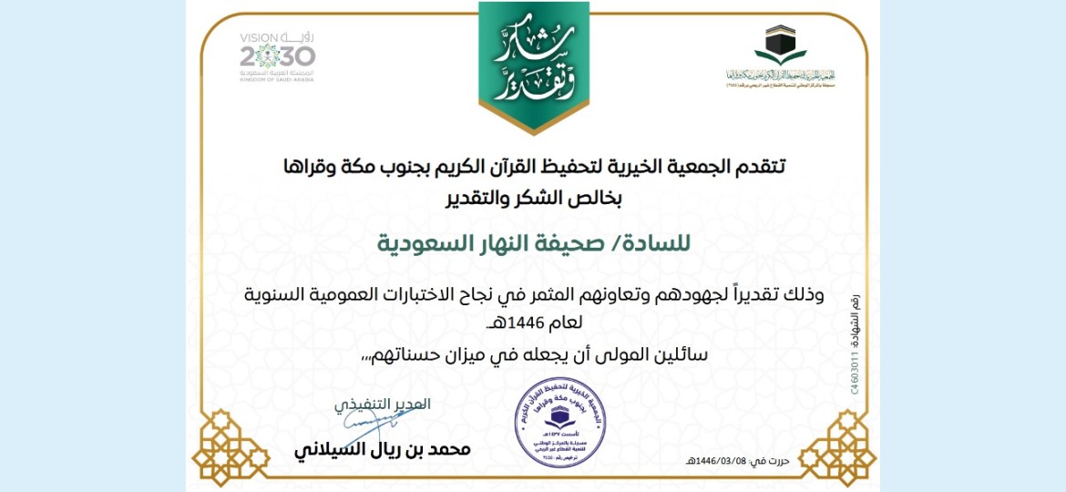 ثمنت الجمعية الخيرية لتحفيظ القرآن الكريم بجنوب مكة وقراها… صحيفة النهار السعودية ومحررتها مرفت بنت محمود طيب