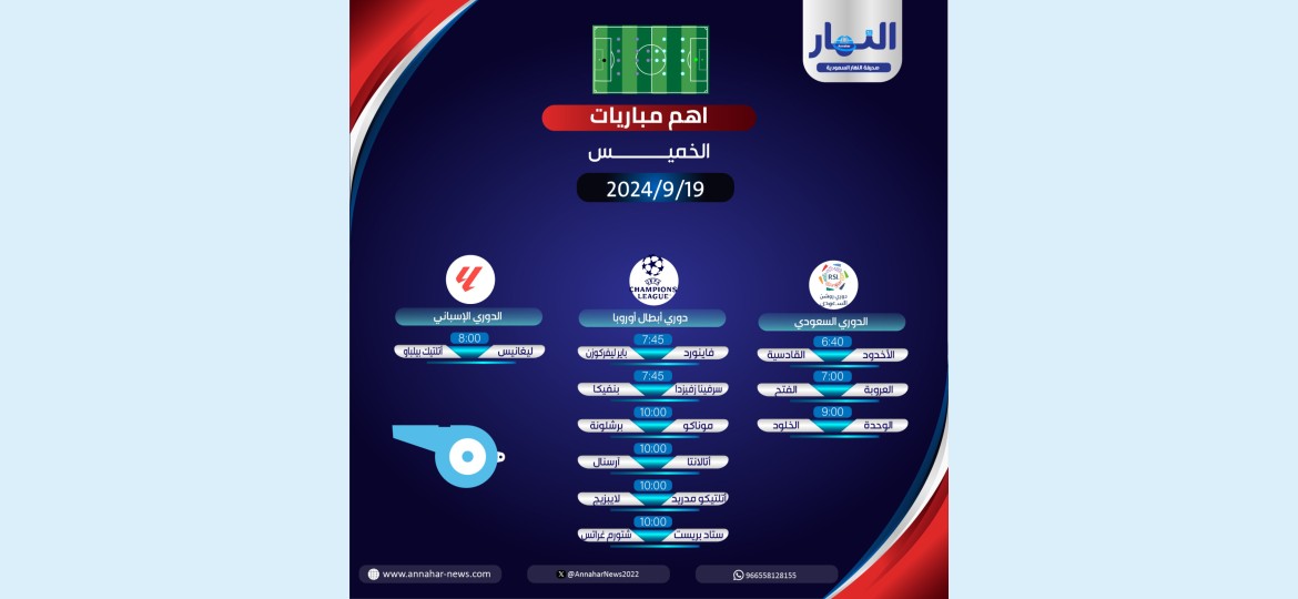 وفي إطار خدماته الإخبارية التي تقدمها صحيفة النهار السعودية لقراءها، وتقدم جدول مواعيد مباريات يوم الخميس 19 سبتمبر 2024.