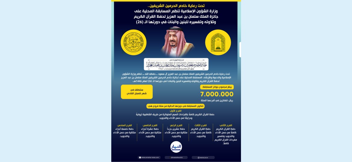 تحت رعاية خادم الحرمين الشريفين الملك سلمان بن عبد العزيز آل سعود ــ حفظه الله ــ، تنظم وزارة الشؤون الإسلامية والدعوة والإرشاد، المسابقة المحلية على (جائزة خادم الحرمين الشريفين الملك سلمان بن عبد العزيز لحفظ القرآن الكريم وتلاوته وتفسيره للبنين والبنات) في دورتها الـ (26) لعام 1446هـ، بجوائز يبلغ مجموعها (7.000.000) ريال، للفائزين في أفرعها الستة.