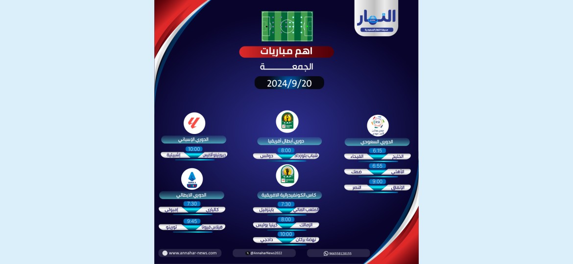 وفي إطار خدماتها الرياضية التي تقدمها صحيفة النهار السعودية، نستعرض جدول أهم مباريات الجمعة 20 سبتمبر 2024 على مستوى العالم، وهي تتمثل في التالي: