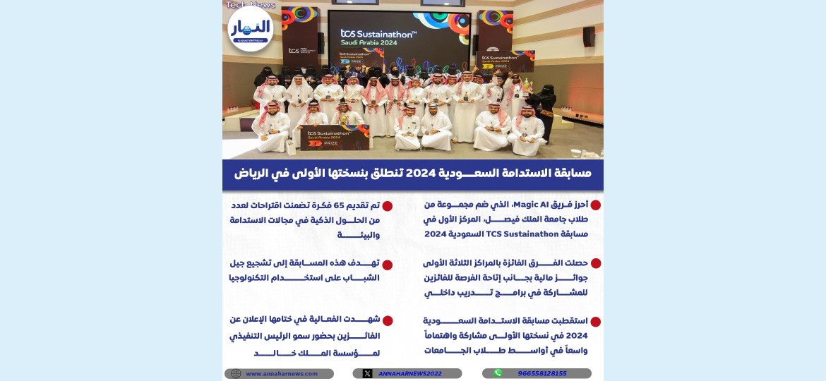 أحرز فريق Magic AI، الذي ضم مجموعة من طلاب جامعة الملك فيصل وجامعة الملك خالد وجامعة الملك سعود، المركز الأول في مسابقة TCS Sustainathon السعودية 2024، التي تم تنظيمها للمرة الأولى في المملكة، ومنحت منح الفرق الفائزة بالمراكز الثلاثة الأولى جوائز مالية إلى جانب إتاحة الفرصة للفائزين للمشاركة في برامج تدريب داخلي.