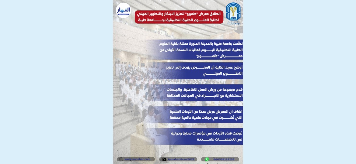 نظّمت جامعة طيبة بالمدينة المنورة ممثلة بكلية العلوم الطبية التطبيقية اليوم فعاليات النسخة الأولى من معرض "طَموح" لعرض المشاريع البحثية والابتكارات العلمية التي قام بها طلاب الجامعة.