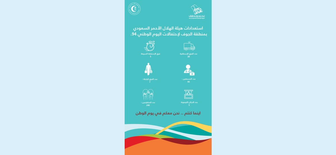 استمرّت هيئة الهلال الأحمر السعودي بمنطقة الجوف في رفع جاهزيتها للاحتفال باليوم الوطني الـ94، حيث شملت الاستعدادات جميع المراكز الإسعافية ومواقع الاحتفالات، وذلك