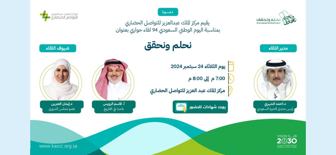 ينظٌم مركز الملك عبد العزيز للتواصل الحضاري لقاءً حوارياً بعنوان "نحلم ونحقق"، بمناسبة اليوم الوطني 94 وذلك مساء اليوم الثلاثاء 24 سبتمبر 2024 م بمقر المركز بالرياض، ويستضيف اللقاء الذي يقام في تمام الساعة السابعة مساءاً، الدكتورة إيمان الجبرين عضو مجلس الشورى، والأستاذ قاسم الرويس الباحث في التاريخ، ويدير اللقاء الدكتور أحمد الشهري رئيس منتدى الخبرة السعودي.