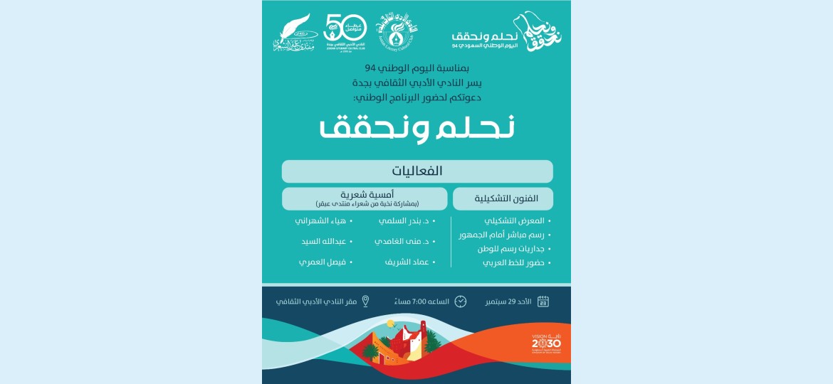 ينظم النادي الأدبي الثقافي بجدة يوم الأحد ٢٩ سبتمبر 2024 المقبل، فعاليات وبرامج احتفالية بمناسبة اليوم الوطني ال94 تحت شعار "نحلم ونحقّق“.