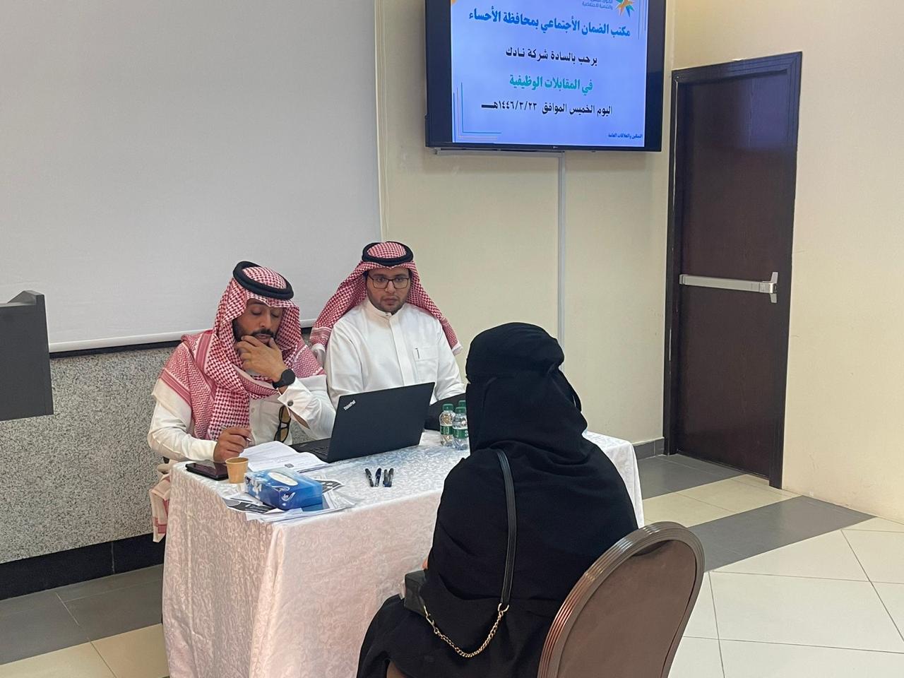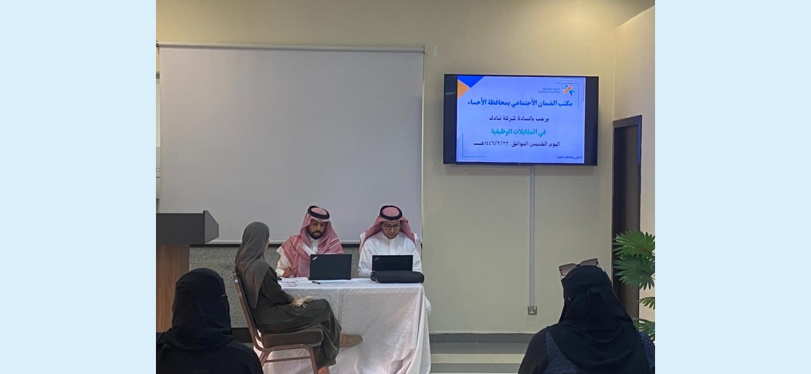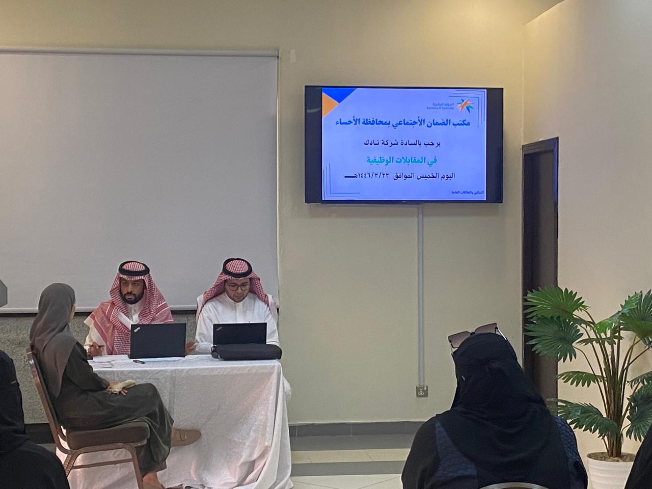 نفذ تمكين مكتب الضمان الاجتماعي بمحافظة الأحساء مقابلات وظيفية بالتعاون مع شركة نادك للألبان استهدفت مستفيدات الضمان الباحثات عن عمل للتقديم على الشواغر الوظيفية المطروحة من قبل الشركة