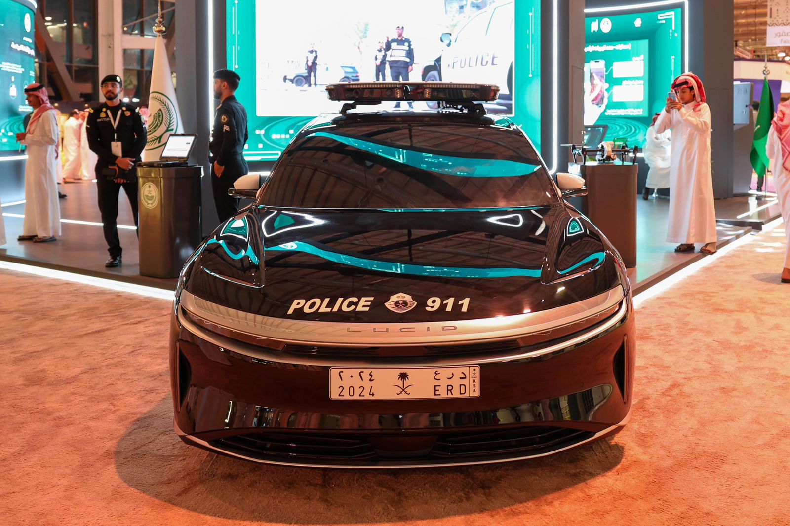 وظهرت اللوحة، على المركبة الأمنية الكهربائية "لوسيد" التي انضمت مؤخرًا إلى منظومة وزارة الداخلية الأمنية لتسهم في تعزيز الأمن وتوظيف تقنيات الذكاء الاصطناعي، وإمكاناتها في حفظ الأمن وحلولها المبتكرة، لتطبيق مفهوم المدن الذكية الآمنة، وتحقيق التوافق والتكامل بين الأنظمة الأمنية، والتشارك المجتمعي والتفاعل الإيجابي بين أفراد المجتمع والأمن.