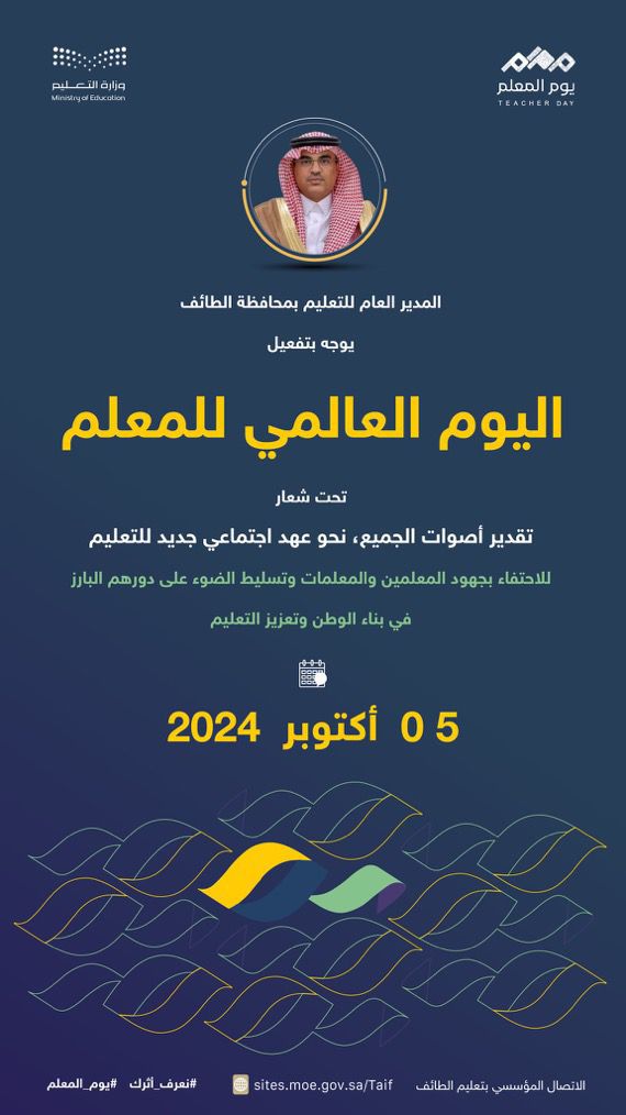 وتحتفي الإدارة العامة للتعليم بمحافظة الطائف باليوم العالمي للمعلم للعام 2024 م تحت شعار “تقدير أصوات الجميع،نحو عهد اجتماعي جديد للتعليم”،