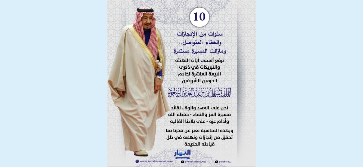نرفع أسمى آيات التهنئة والتبريكات في ذكرى البيعة العاشرة لخادم الحرمين الشريفين الملك سلمان بن عبدالعزيز.