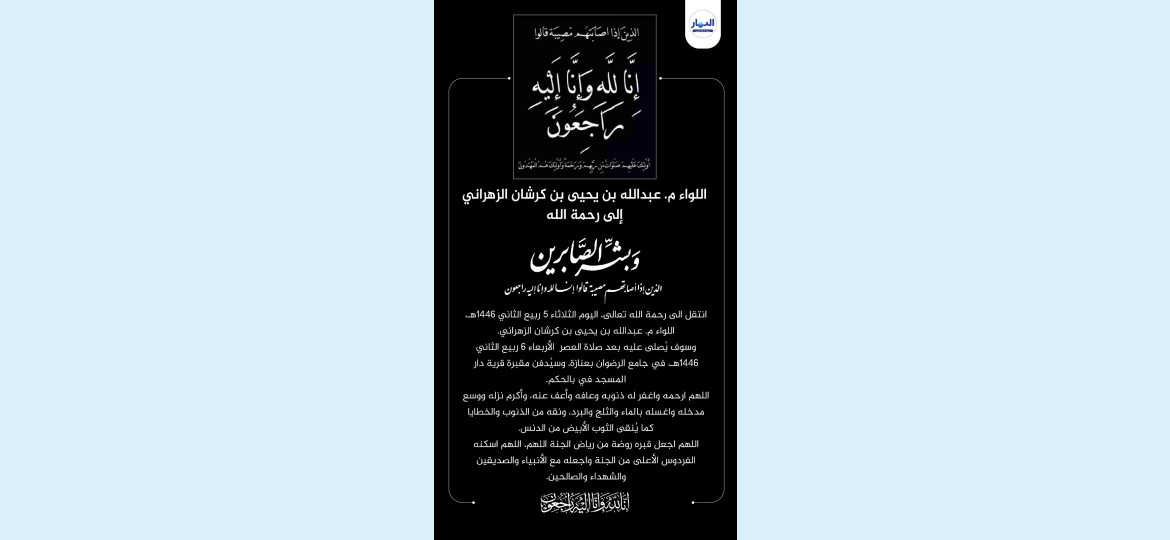 "وبشر الصابرين الذين إذا أصابتهم مصيبة قالوا إنا لله وإنا إليه راجعون"، انتقل الى رحمة الله تعالى، اليوم الثلاثاء ٥ ربيع الثاني ١٤٤٦هـ، اللواء م. عبدالله بن يحى بن كرشان الزهراني.